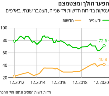 According to the Economic Analysis Division of the Ministry of Construction and Housing, out of approximately 113.5 thousand transactions for the purchase of apartments made in 2020, the number of transactions for second-hand apartments decreased to approximately 73,000 - from a level of approximately 87,000 in 2015; While the number of deals in new apartments rose to about 41,000 last year, from a level of about 23,000 apartments in 2012.